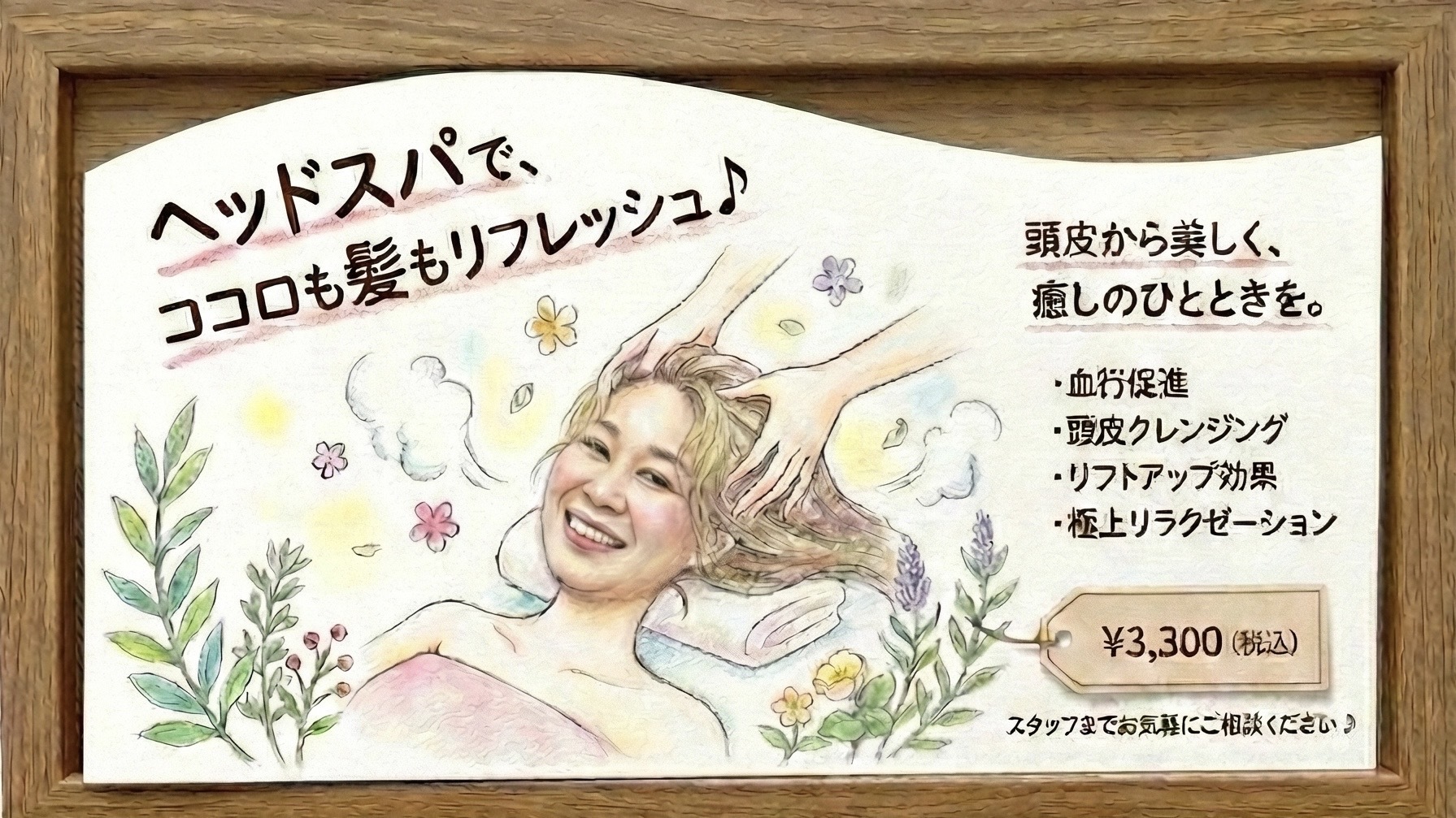 明るいだけじゃない力自慢のようこちゃんがヘッドスパのPOPになってます!